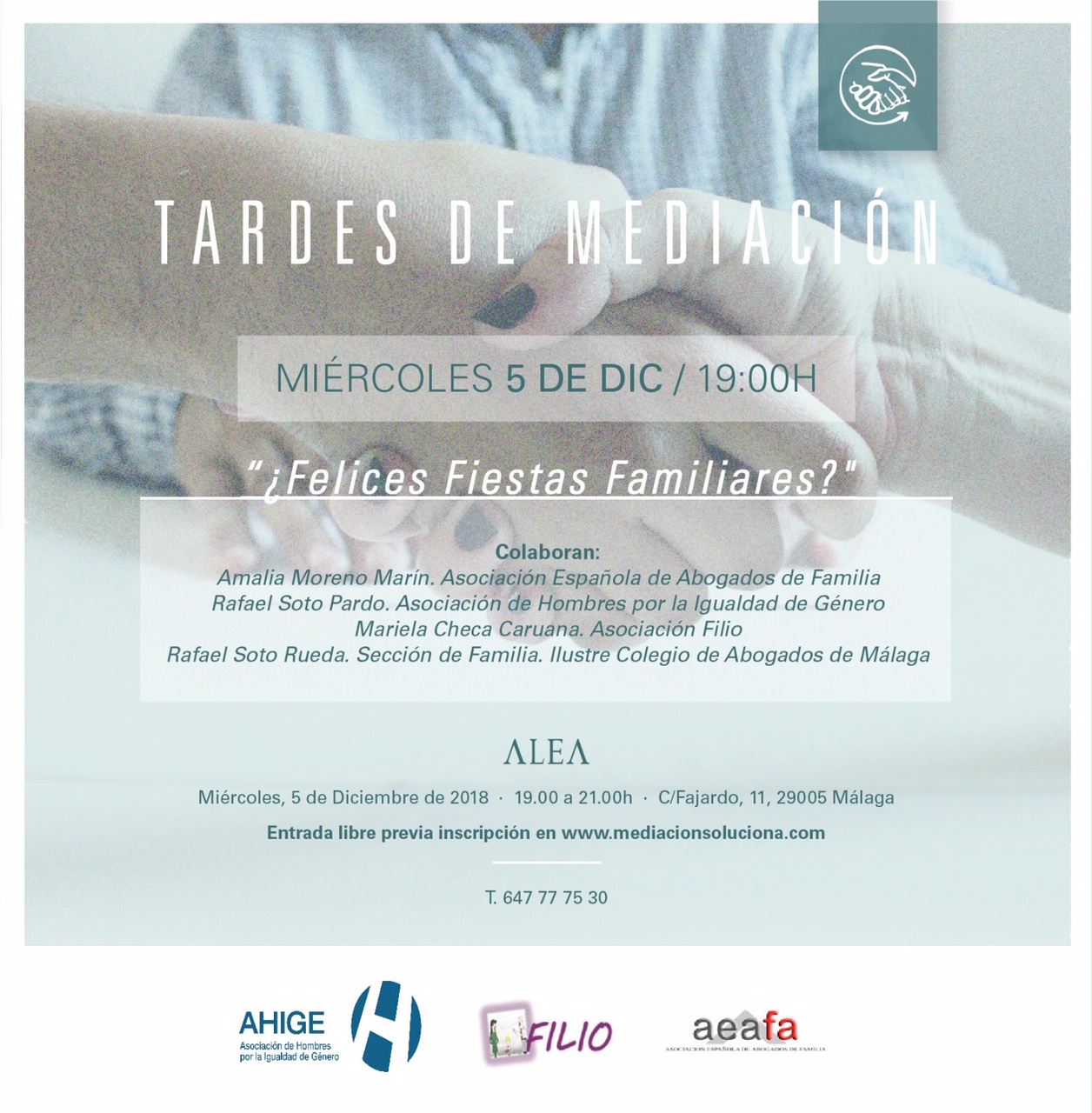 Este mes debido a la festividad del Jueves y la posibilidad de puente en muchas familias, la Tarde de Mediación será el Miércoles 5 de Diciembre, a las 19 Horas, en el Restaurante ALEA